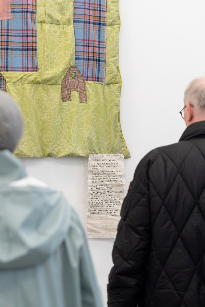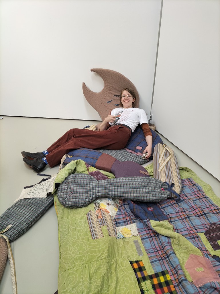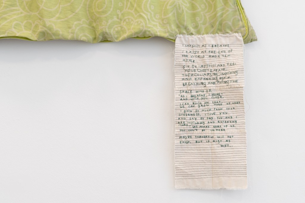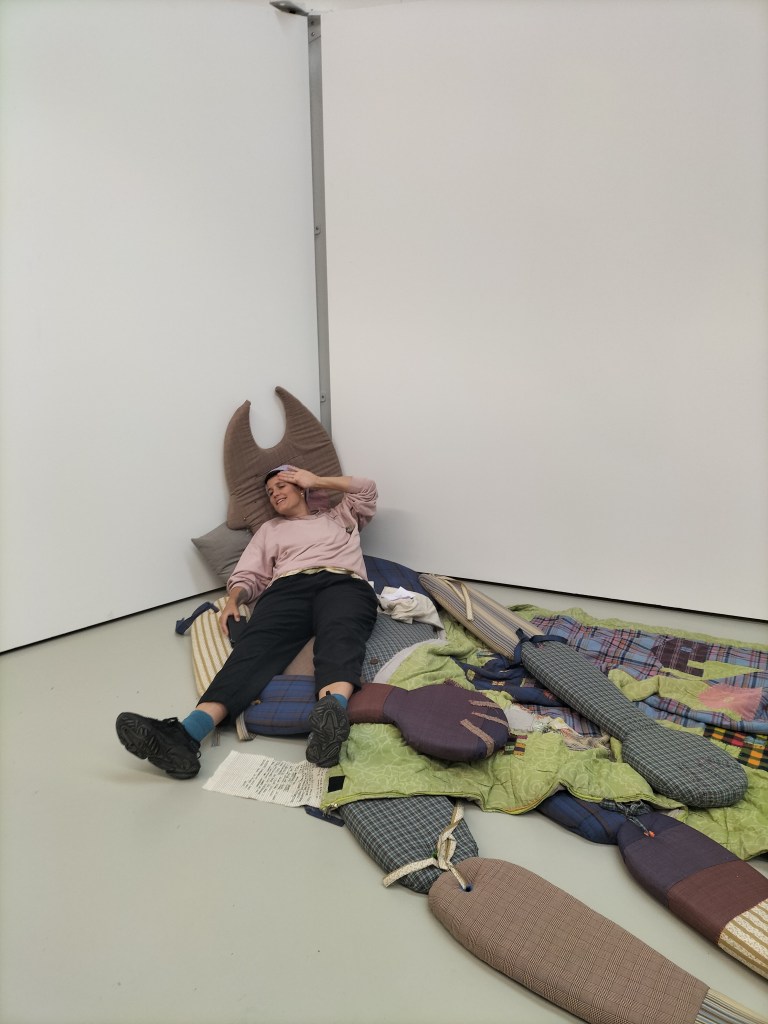 This 4 meters tall puppet cuddled up to a home-blanket encapsulates Ro’s work. Almost a symbol of themself, they took a blanket that’s been with them since childhood and repaired it and covered it with words of love and hope and homes, a thank you to what has brought them comfort so many times over. You are invited to touch, caress, lie on, and cuddle up with this puppet, let it comfort you and allow yourself to find this softness and relief within yourself.