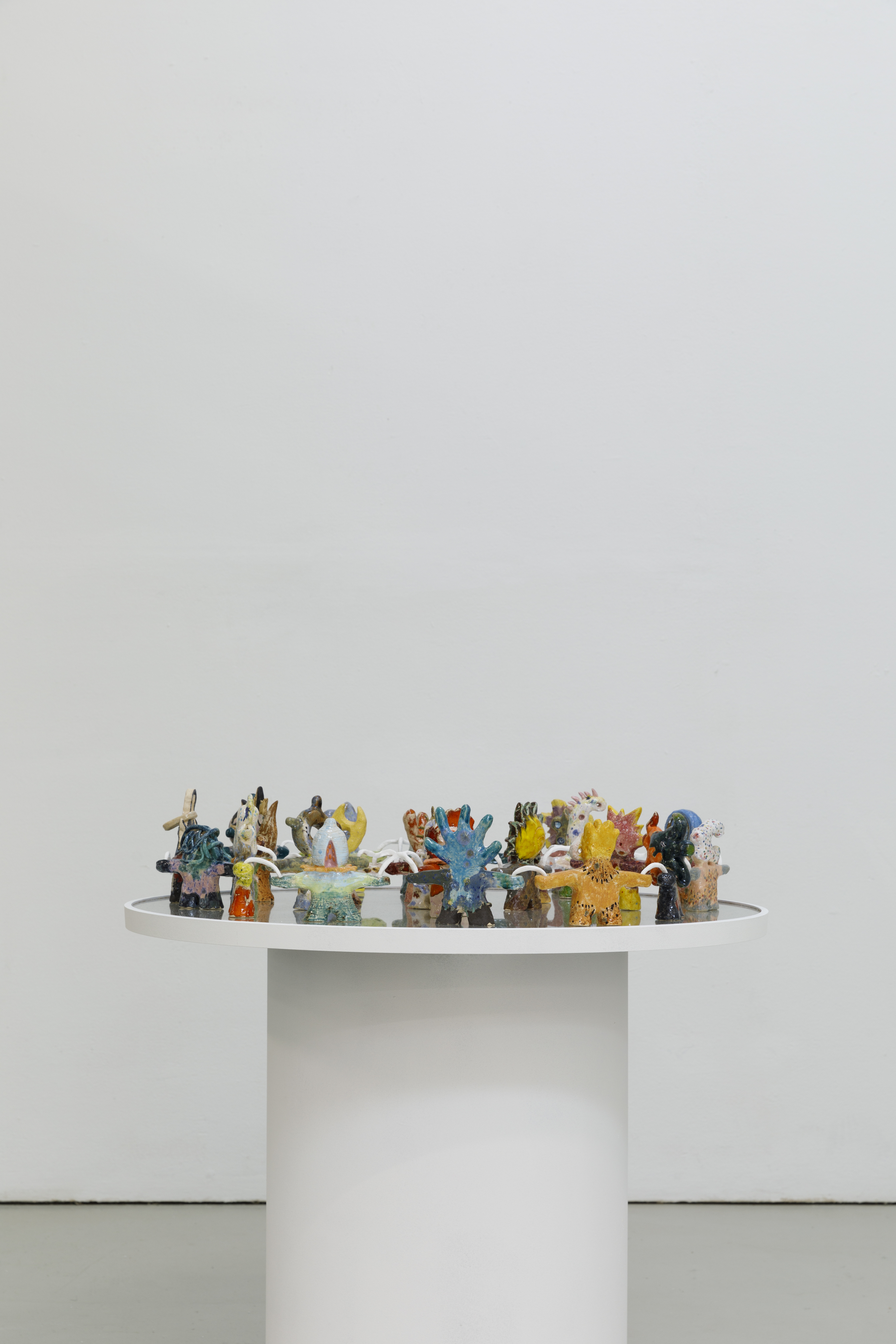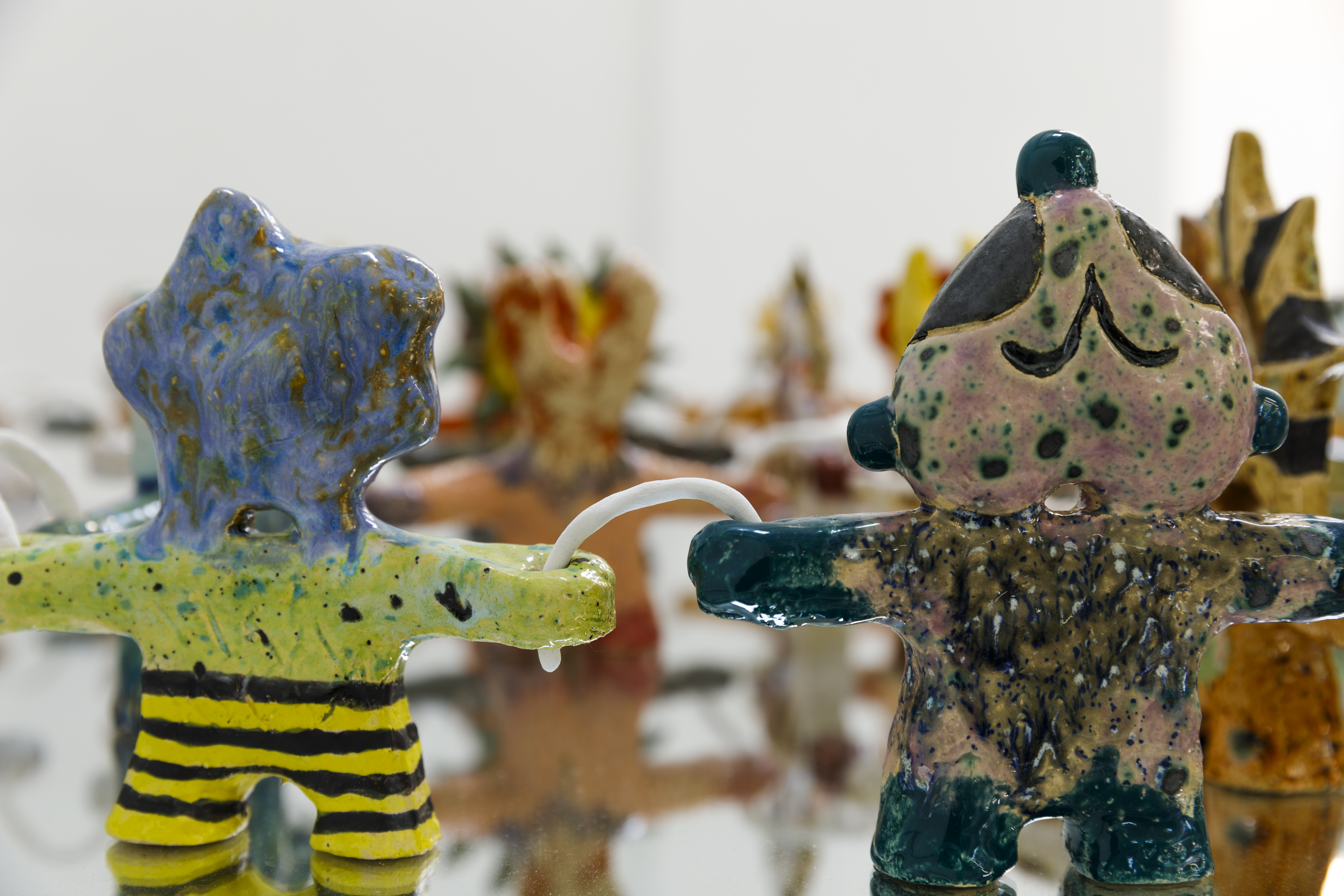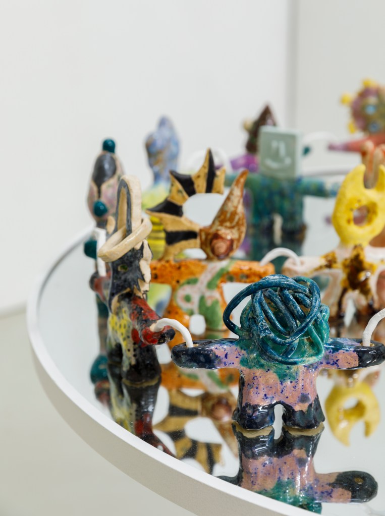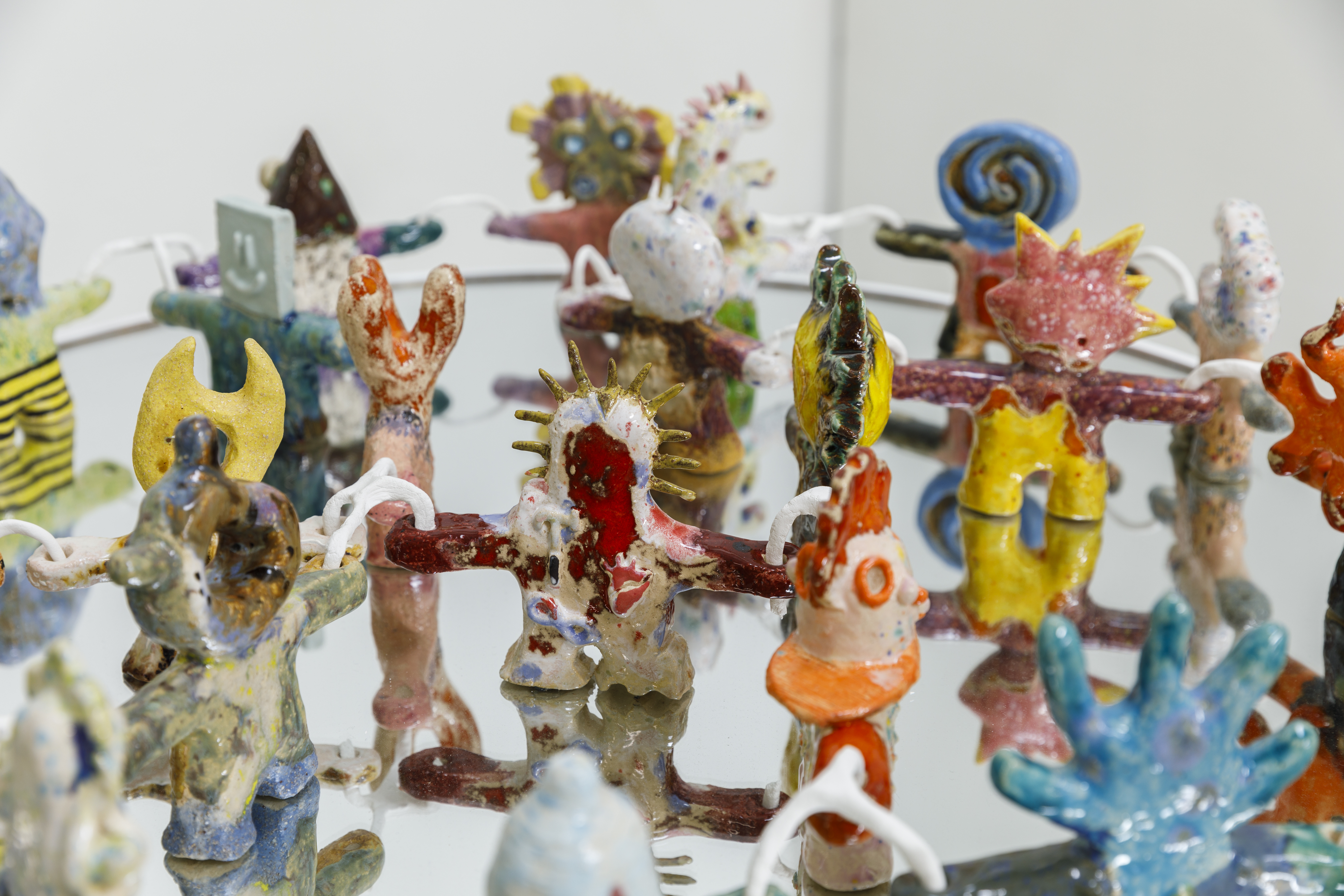 The ceramic statues can be interlocked and moved around in different ways. Thanks to the reflection of the mirror the works feel even more like a close knitted community. When the public looks at the work and in the mirror, they see not only themselves in the reflection, but also the ceramic statues. Many may not know these people I deeply care for but they may see themselves reflected in the colours and shapes of them. In a way, the spectator becomes a part of this community when they immerse themself into the reflection